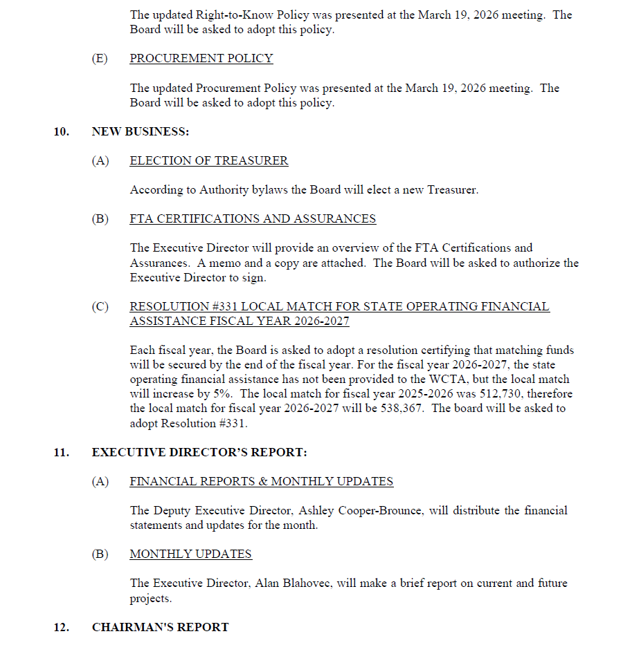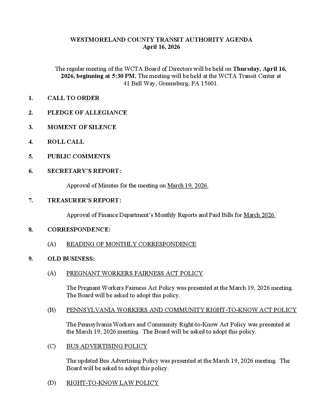 Westmoreland Transit is governed by a seven-member Board of Directors: